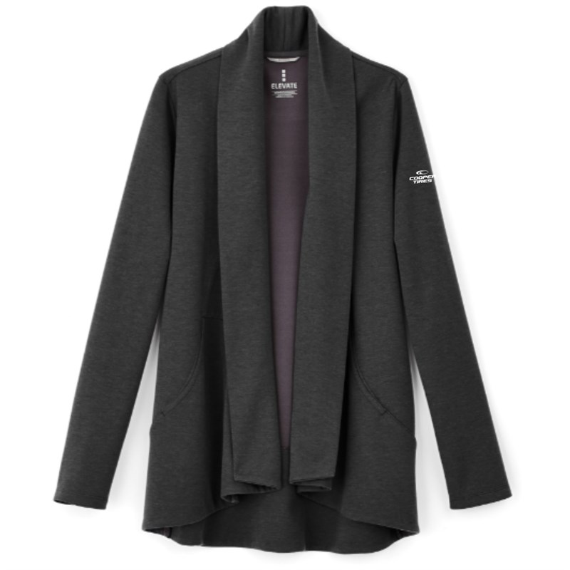 Cross-dyed, washable, snag-resistant, low-pill, 7.2 oz., 83% polyester/17% wool interlock double-knit. Shawl collar. Contrast inner neck tape. Contrast hanger loop at inside back neck. Open front. Front slant pockets. Dropped back hem. Shaped seams and tapered waist for flattering fit. Product Color: Heather Dark Charcoal Branded with the Cooper Tire logo